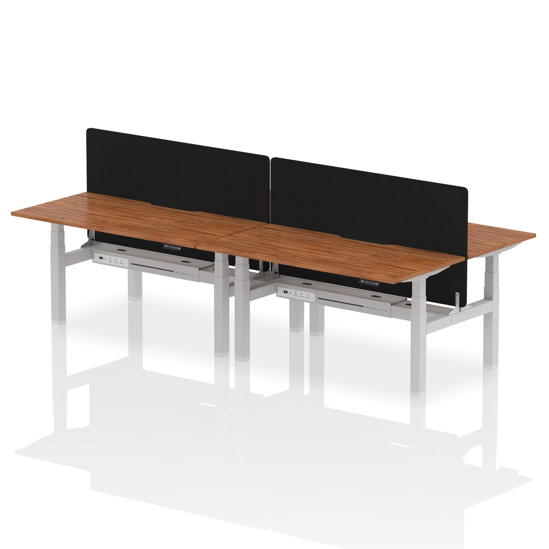 Experience cutting-edge collaboration with the Air Back-to-Back Height Adjustable Desk for four, featuring a unique scalloped edge design and a dividing screen per duo. Each desk is outfitted with two Ethernet ports, a USB port, a USB-C port, and three UK plugs, ensuring unparalleled connectivity. The adjustable height caters to ergonomic needs, making it perfect for dynamic teams who prioritize both style and functionality in their workspace.
