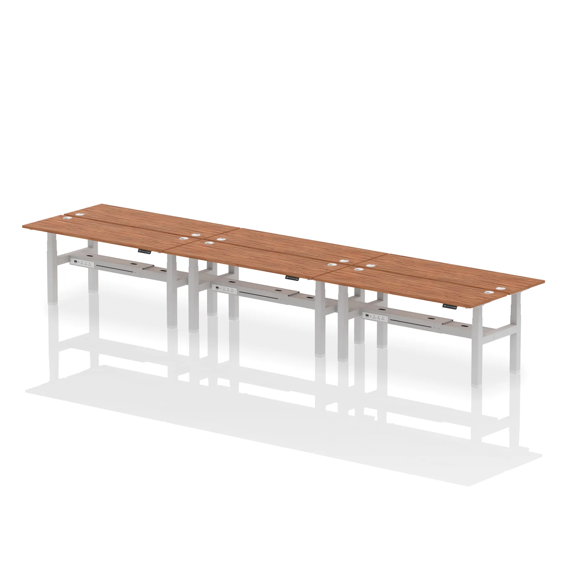 Introducing the Air Back-to-Back Slimline Height Adjustable Desk, a sleek solution for six. Each desk features dual Ethernet ports, a USB port, a USB-C port, and three UK plugs, ensuring comprehensive connectivity. The design includes cable ports for a neat workspace. Its height-adjustable feature caters to ergonomic comfort. Ideal for teams seeking a streamlined and flexible working environment, this workstation redefines collaborative efficiency.
