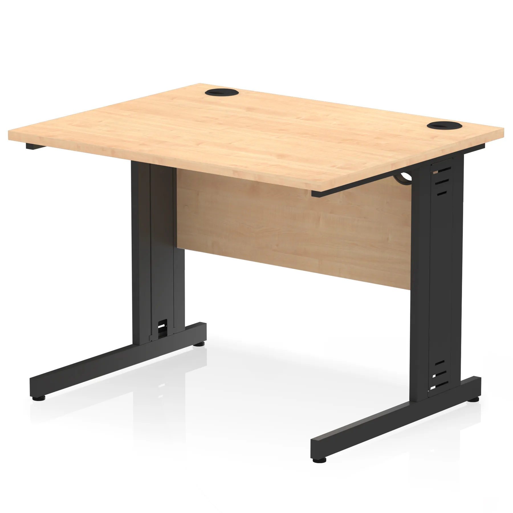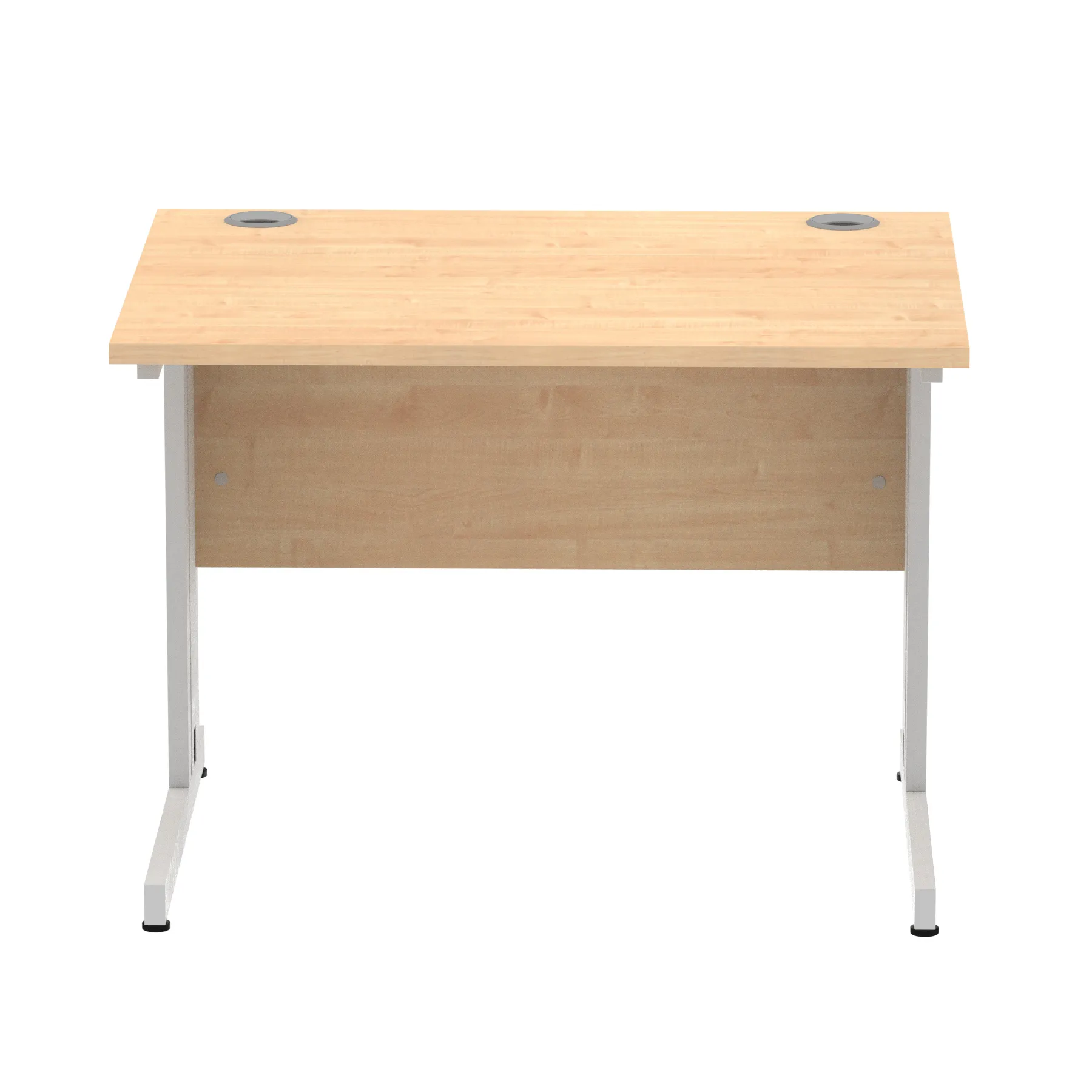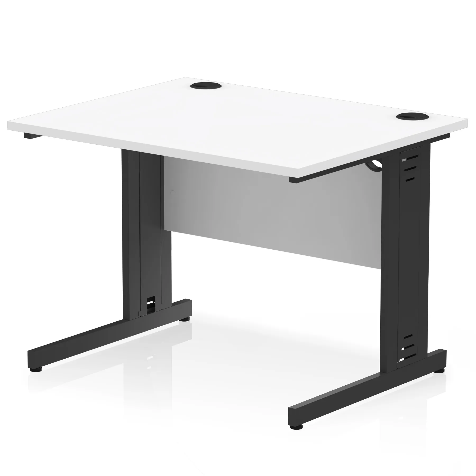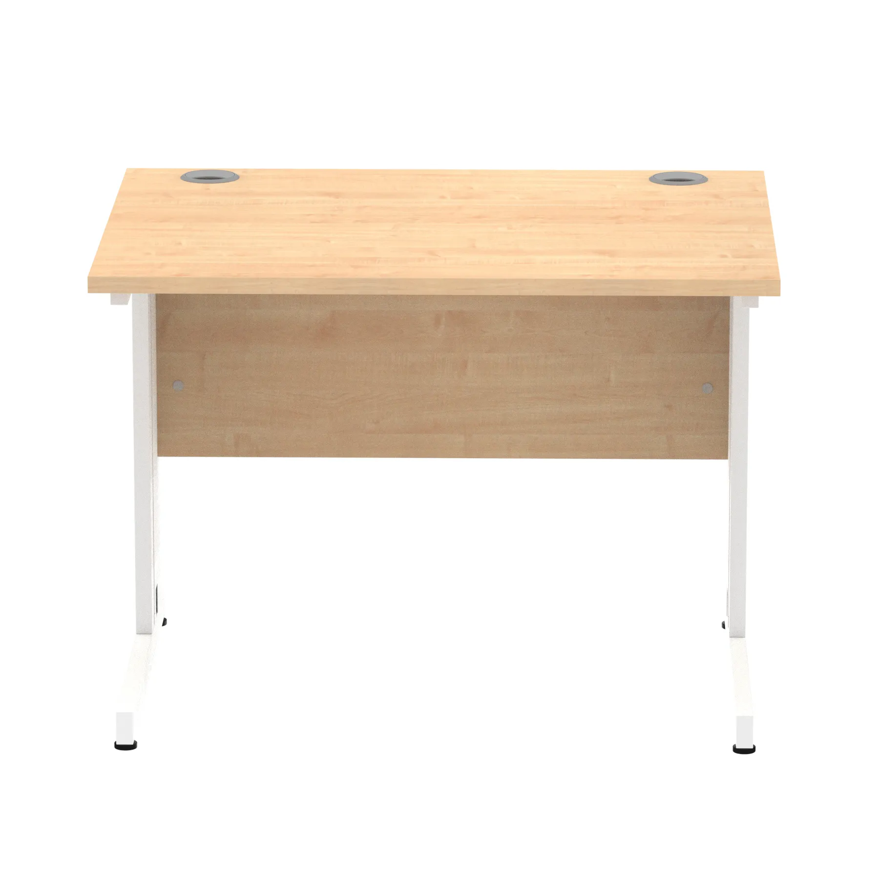 Impulse contract desk | 25mm tops | Wire management panel | Heat resistant melamine finish | 18mm modesty panel | 2mm protective abs edging | Cable managed legs | 2 cable ports | Height adjustable feet | Steel to steel fixings | 2 modesty panel slots | Deep set modesty panel (5″) allows for compatibility of most screen clamp fittings | Weight Capacity 135Kg