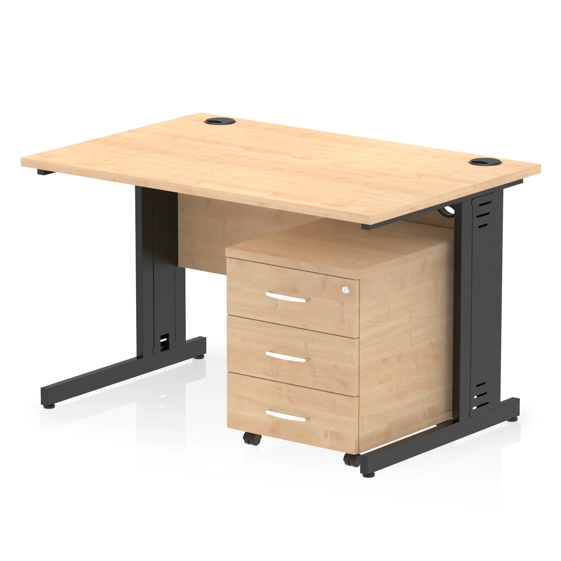 Impulse contract workstation | 25mm tops | Desk and pedestal combined | Heat resistant melamine finish | 18mm modesty panel | 2mm protective abs edging | Cable managed legs | Multiple cable ports | Height adjustable feet | Steel to steel fixings | Modesty panel slots wire slots | Deep set modesty panel (5″) allows for compatibility of most screen clamp fittings