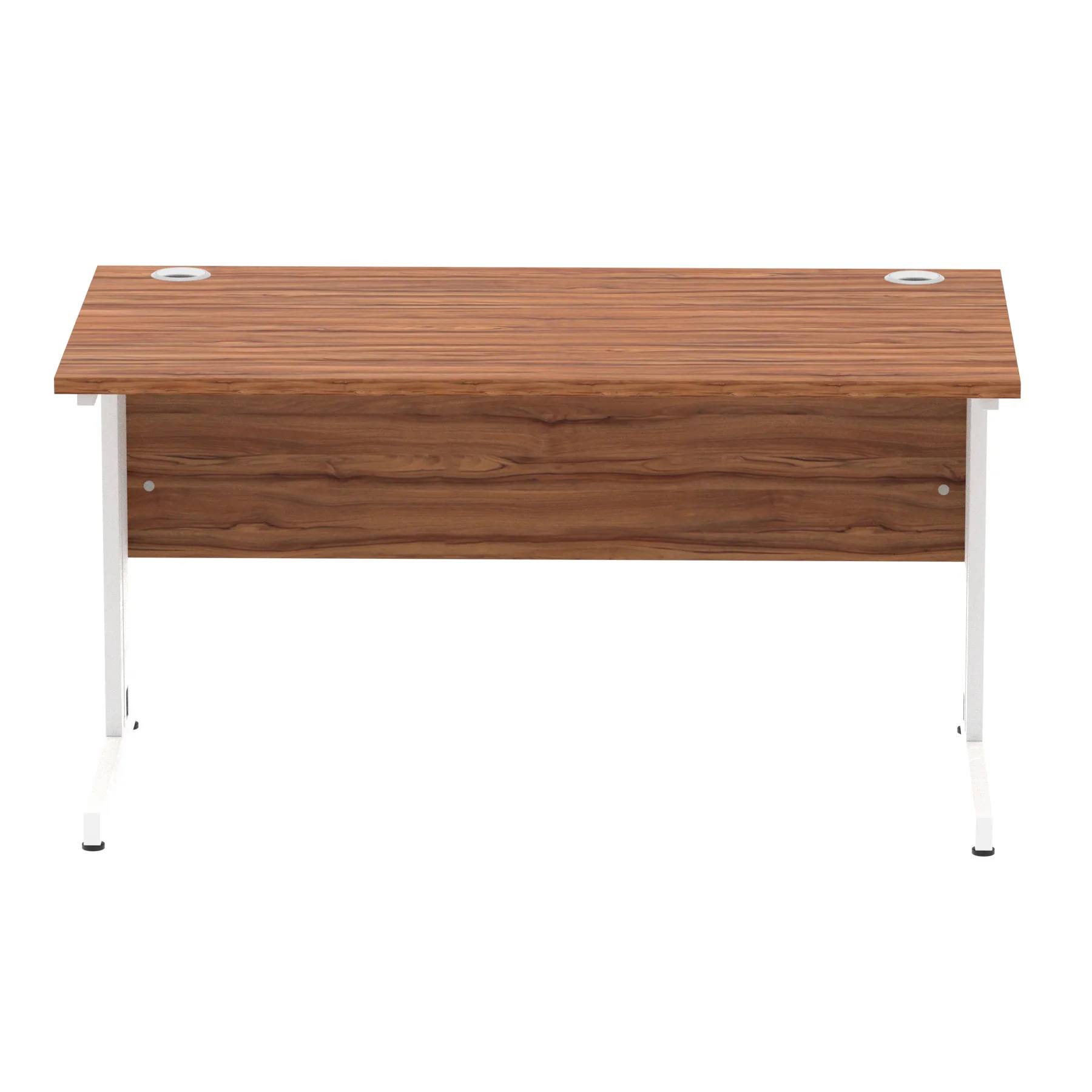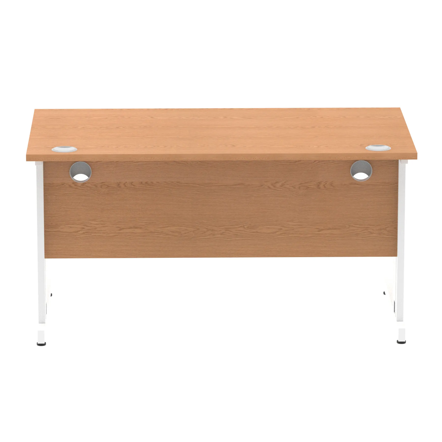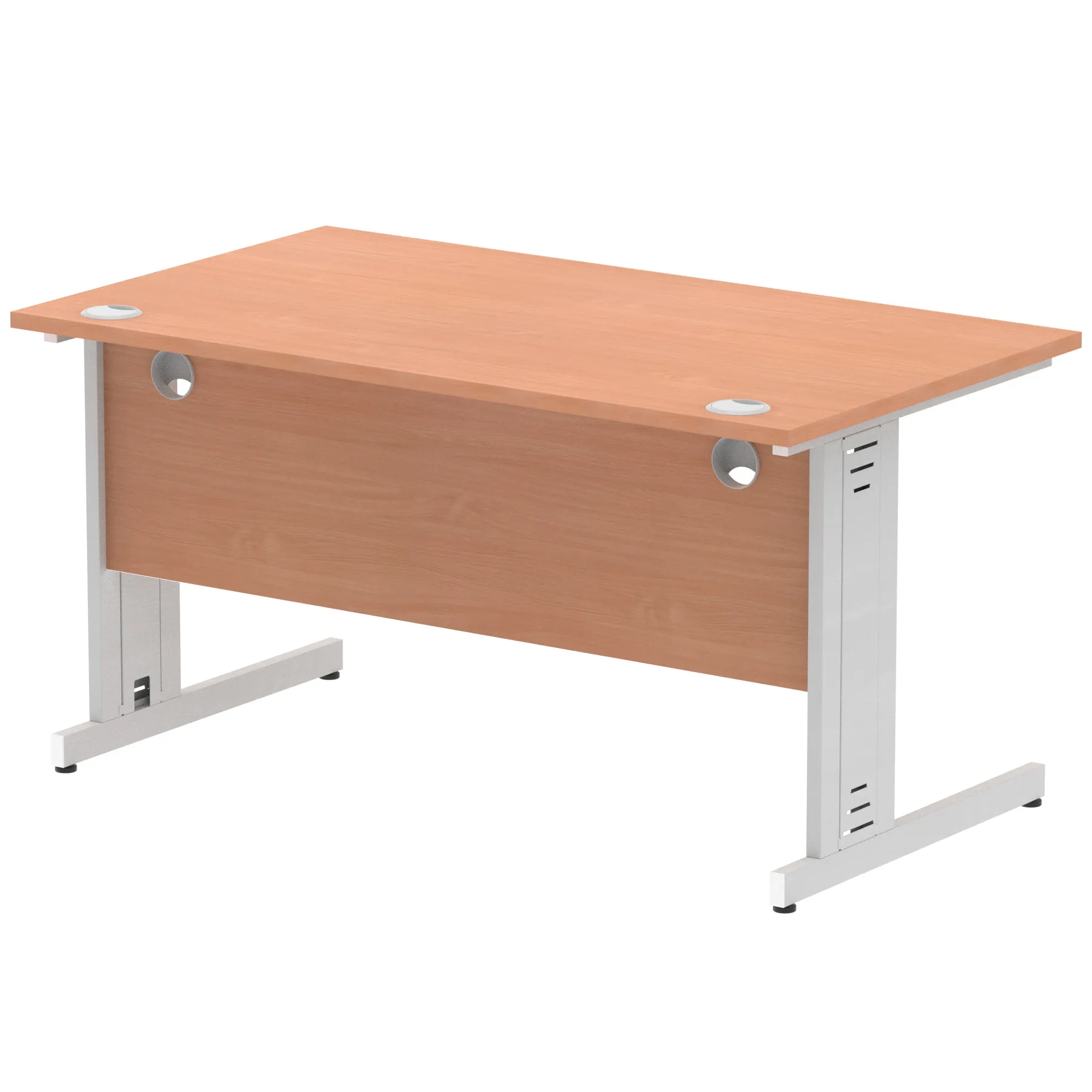 Impulse contract desk | 25mm tops | wire management panel | Heat resistant melamine finish | 18mm modesty panel | 2mm protective abs edging | Silver coated double strut legs | 2 cable ports | Height adjustable feet | Steel to steel fixings | 2 modesty panel slots | Deep set modesty panel (5″) allows for compatibility of most screen clamp fittings | Weight Capacity 135Kg
