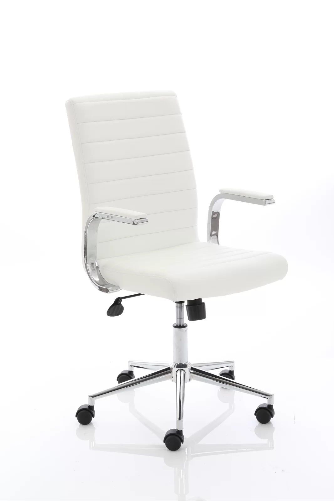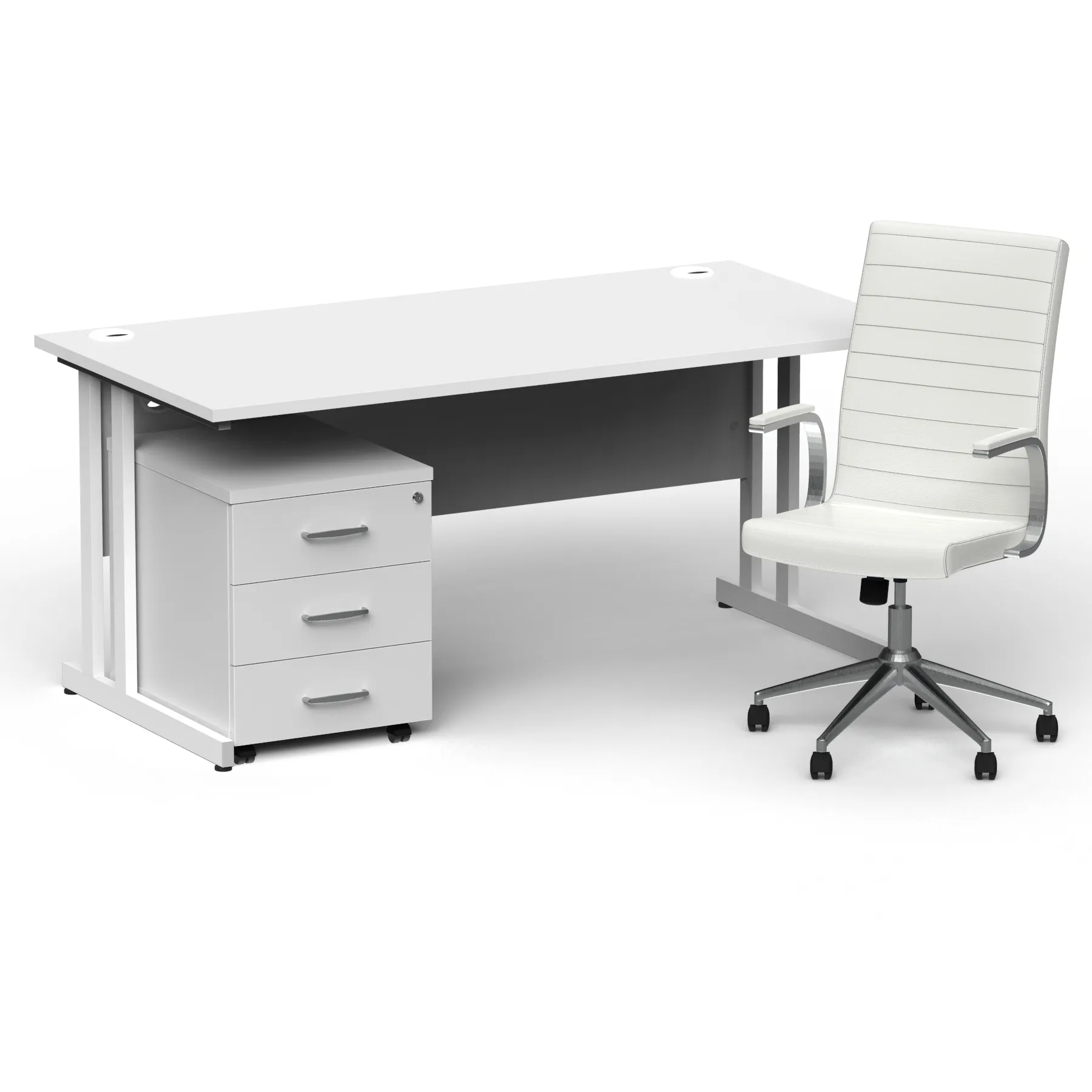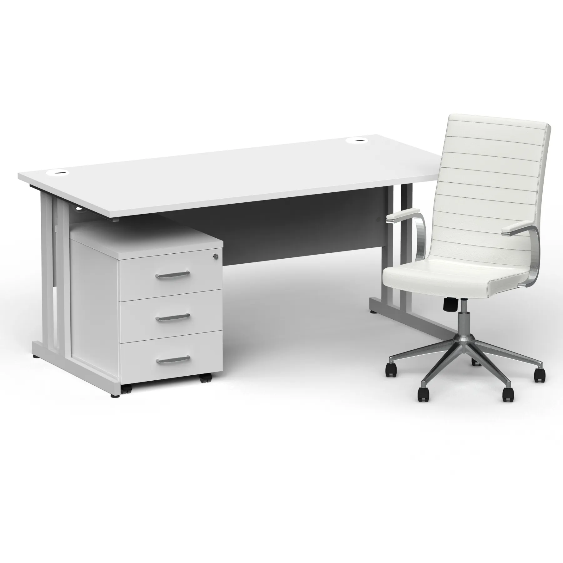 Impulse contract desk | 25mm tops | Heat resistant melamine finish | 18mm modesty panel | Double strut legs | Steel to steel fixings | Impulse mobile pedestal | Steel handles | Smooth running castors for mobility | Lockable drawers | Solid drawer construction | Ezra executive chair | Stylish stich detail | Soft touch bonded leather | Single lever lock tilt mechanism | Weight tension adjustment | Fixed padded arms | Gas lift tested up to 150kg | Usage: 8 hours