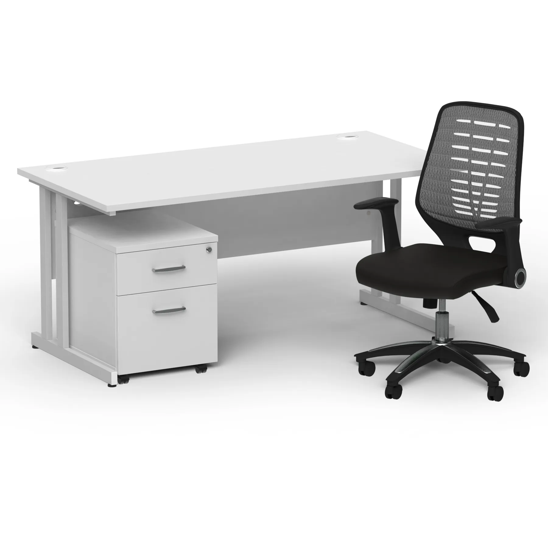 Impulse contract desk | 25mm tops | Heat resistant melamine finish | 18mm modesty panel | Double strut legs | Steel to steel fixings | Impulse mobile pedestal | Steel handles | Smooth running castors for mobility | Lockable drawers | Solid drawer construction | Relay operator chair | Airmesh fabric seat cushion | Soft mesh backrest with stylish design | 2 lever infinite lock tilt mechanism | Weight tension controlled | Fold back boomerang arms | Gas lift tested to 110kg | Usage: 8 hours