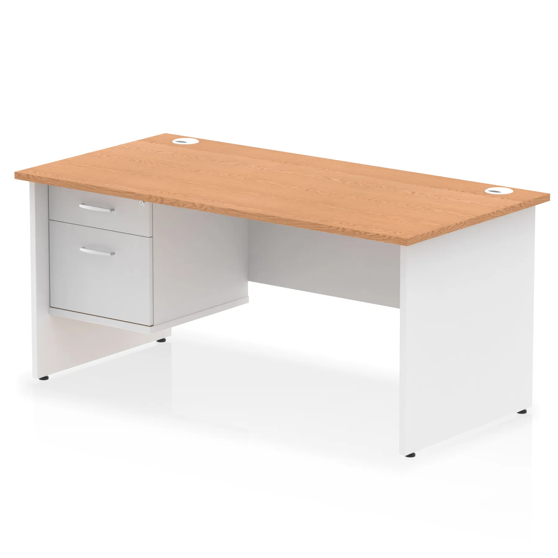 • Impulse contract 1600 wide desk • 25mm tops • Heat resistant beech melamine finish • 18mm modesty panel • 2mm protective abs edging • Matching wood panel end legs • 2 cable ports • Height adjustable feet • Steel to steel fixings • 2 modesty panel slots • Deep set modesty panel (5”) allows for compatibility of most screen clamp fittings • Fixed pedestal