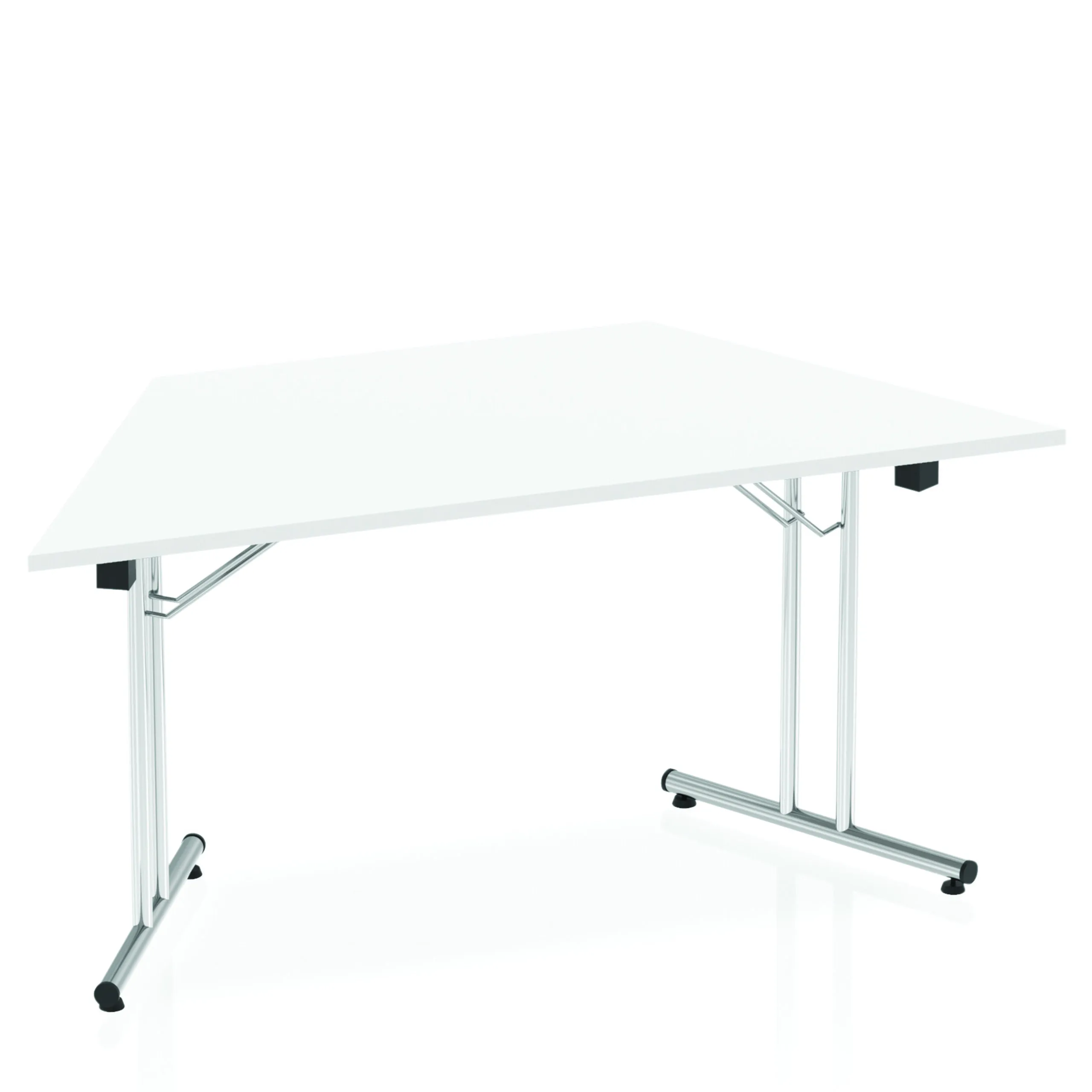 Impulse freestanding meeting table | Trapezoidal shape for groups of tables | Table folds easily for space efficient storage | Provides excellent team working environment | Slanted sides measure 800mm from corner to corner | 25mm thick top | Attractive silver coated leg | 2mm abs protective edging | Heat resistant beech melamine finish | Steel to steel fittings | Weight Capacity 100Kg