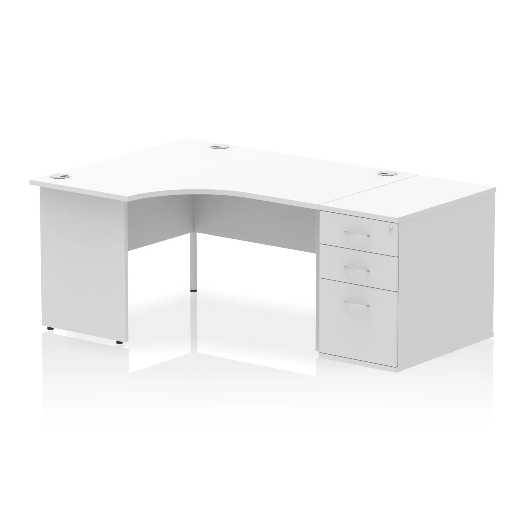 Impulse contract workstation | 25mm tops | Desk and pedestal combined | Heat resistant beech melamine finish | 18mm modesty panel | 2mm protective abs edging | Matching panel ends | Multiple cable ports | Height adjustable feet | Steel to steel fixings | Modesty panel slots wire slots| Deep set modesty panel (5″) allows for compatibility of most screen clamp fittings
