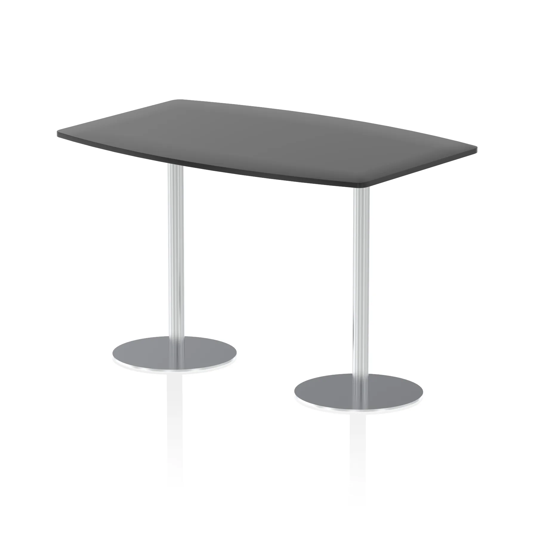 25mm thick desk top profile | Dual, brushed stainless steel effect circular base (580mm diameter) | Brushed stainless steel pillars (76mm diameter) | Weighted base provides stability | Writable desk surface