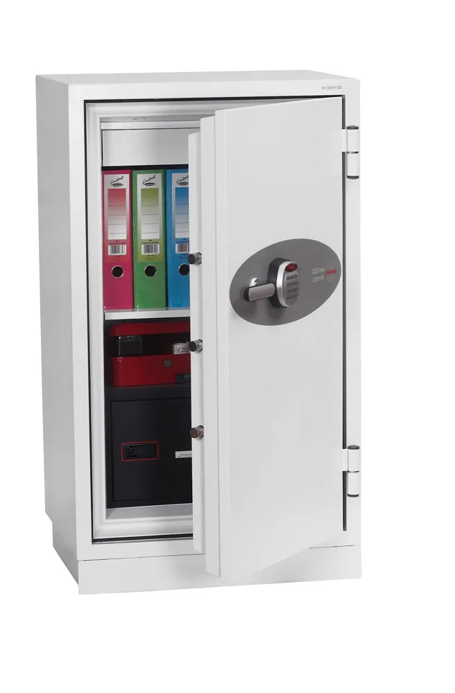 FIRE PROTECTION (PAPER) – Tested to Swedish NT Fire 017 – 90 Paper (Size 1 or 2) or 120 Paper (Size 3), providing 90 or 120 minutes fire protection respectively for paper documents | FIRE PROTECTION (DATA) – Tested to Swedish NT Fire 017 – 90dis (Size 1 or 2) or 120dis (Size 3), providing 90 or 120 minutes fire protection respectively for computer diskettes, tapes and all forms of data storage | FIRE PROTECTION (DIGITAL MEDIA) – Tested to MTC – DIP120 – 60DM fire test standard, providing 60 minutes fire protection for digital media, DVD’s, USB memory sticks and hard drives | SECURITY PROTECTION – Recommended for an overnight cash risk of £2,500.00 or £25,000.00 valuables | DROP TEST – Fire and impact tested from 9.1 metres for resistance to the impact of falling through the burning floors of a building | FITTINGS – Each safe comes complete with a height adjustable shelf, lockable drawer and internal key hooks | FIXING – Ready prepared for floor fixing with fixing bolts for concrete supplied | SPECIAL FEATURES – Fitted with automatic slam shut door locking | COLOUR – Finished in a high quality scratch resistant paint RAL9003 White