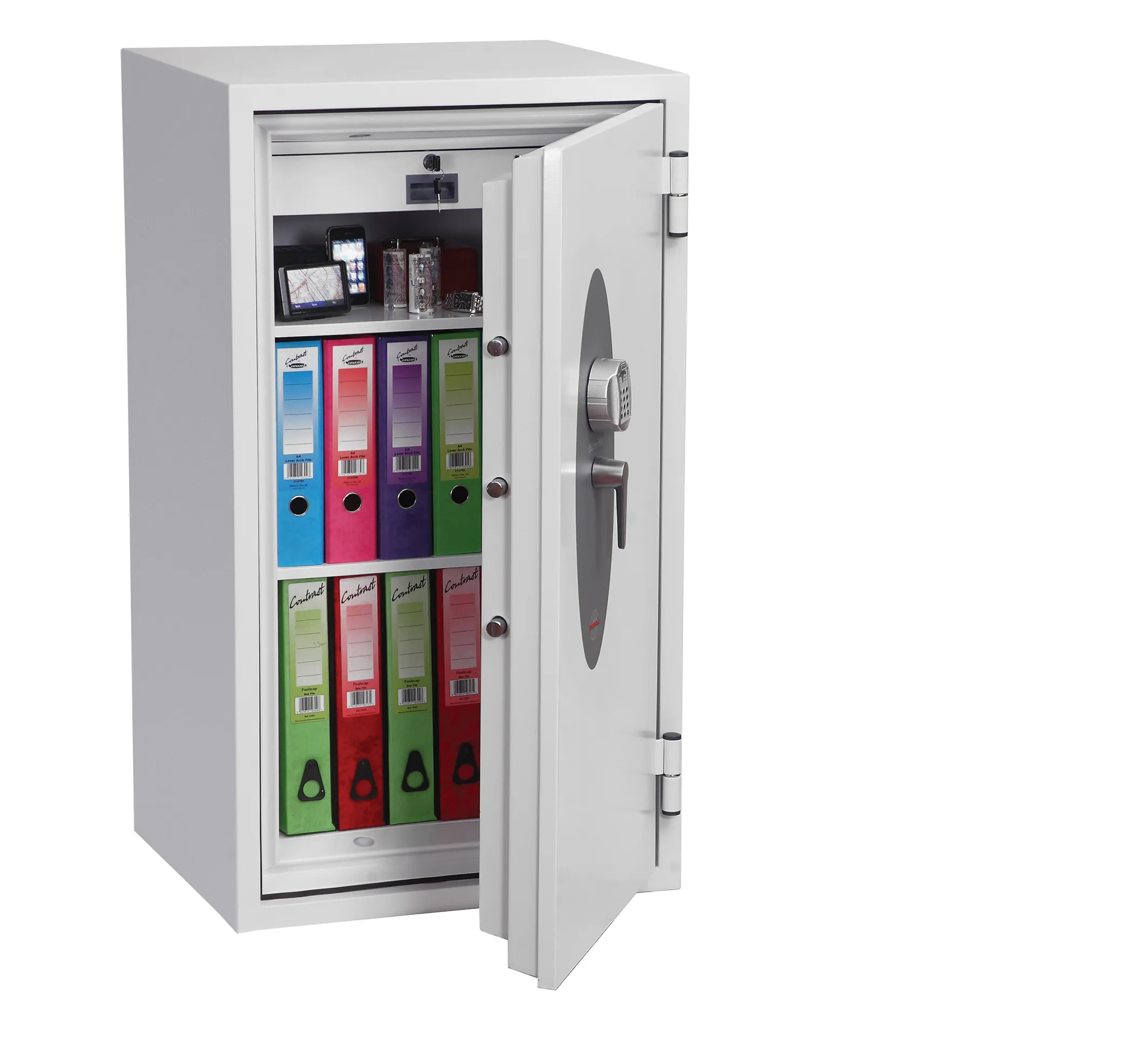 SECURITY PROTECTION – Tested to the prestigious European S2 Security standard (EN14450 ECB.S Certified) giving cash cover of £4,000 or valuables cover of £40,000 | APPROVALS – UK Police approved (Secured by Design scheme) and the Association of Insurance Surveyors (AiS) | FIRE PROTECTION (PAPER) – Tested to the Swedish NT Fire 017-120 Paper standard, providing 120 minutes fire protection for paper documents | FIRE PROTECTION (DIGITAL MEDIA) – Tested to MTC – DIP120 – 60DM fire test standard, providing 60 minutes fire protection for digital media, DVD’s, USB memory sticks and hard drives | FEATURES – Internal lockable steel drawer unit and supplied with 2 height adjustable shelves | DROP TEST – Fire and impact tested from 9.1 metres for resistance to the impact of falling through the burning floors of a building | CONSTRUCTION – Double wall construction with high grade concrete infill to provide both fire and burglary protection | FIXING – Ready prepared for floor fixing, with fixing bolts for concrete supplied | COLOUR – Finished in a high quality scratch resistant White paint RAL9003 | Suitable for storage of controlled drugs whose active ingredients do not exceed 500 grams